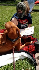 Many agencies joined in the park to showcase the help they offer our families. Amita and Roadie got to enjoy being read to and, of course, being loved up. Roadie assumed his favorite position and was rewarded with tons of belly rubs!