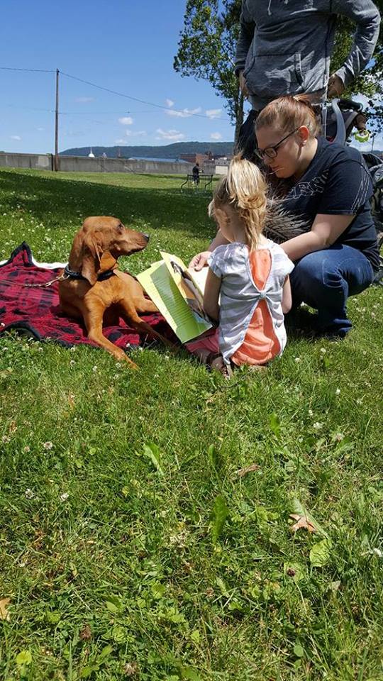 Many agencies joined in the park to showcase the help they offer our families. Amita and Roadie got to enjoy being read to and, of course, being loved up. Roadie assumed his favorite position and was rewarded with tons of belly rubs!